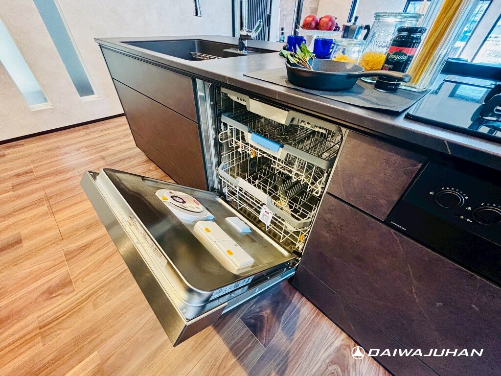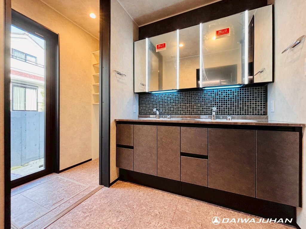 朝の時間帯もゆとりを生むツーボウル洗面。高級感漂うモザイクタイルと大容量のミラーボックスが、機能美と意匠性を両立。