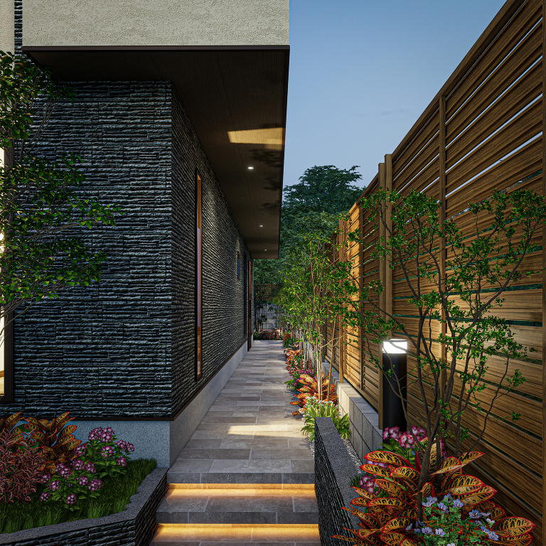 道路からの視線をさりげなく遮りつつも、開放感を確保したファサード。緑との調和も美しく、街並みに自然と溶け込むデザイン。