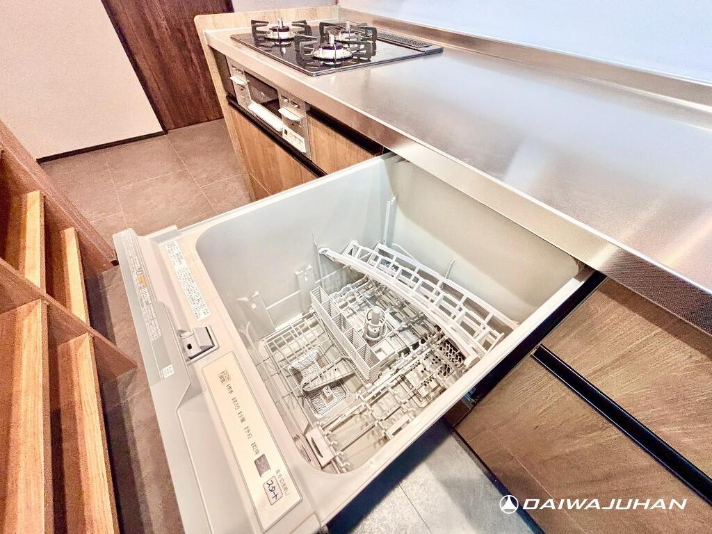 ビルトインタイプの食器洗い乾燥機を搭載。忙しい日々の家事をサポートし、後片付けの負担を軽減します。手荒れ予防や節水にも役立ちます。