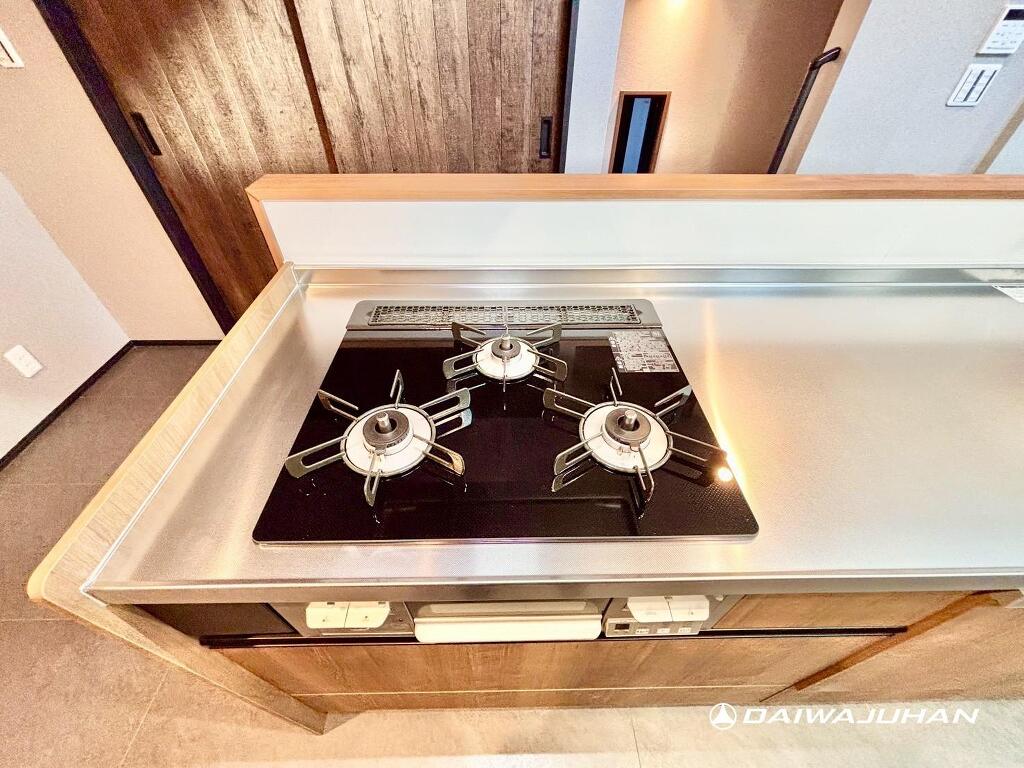 三口コンロで複数の調理を同時に進めやすく、時短調理に便利。魚焼きグリルも備えており、焼き物やトーストにも活躍します。料理が楽しくなる仕様です。