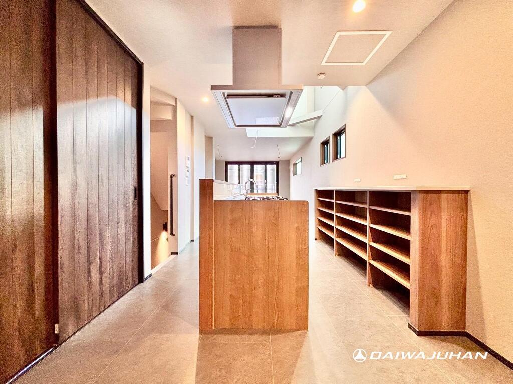 キッチン背面には、オープンタイプのカップボードを設置。食器や調理器具、ストック品などを効率よく収納でき、作業スペースとしても活用できます。