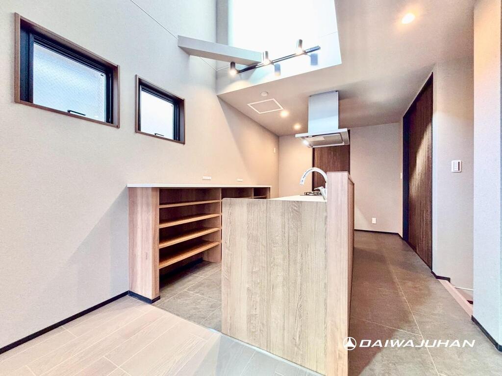 吹き抜けのある明るいキッチン空間。アイランド型のレイアウトで動きやすく、家事のしやすさにも配慮されています。窓と収納棚が整い、実用性も十分です。