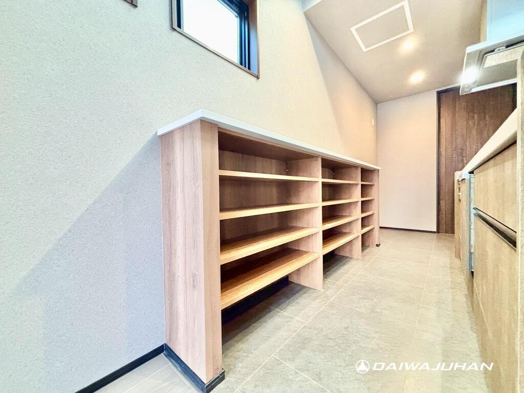 キッチン向かいに設けられたパントリーは、調理中の動線もスムーズ。食品やキッチン用品をすっきり収納でき、コンセント付きで家電の設置にも対応します。