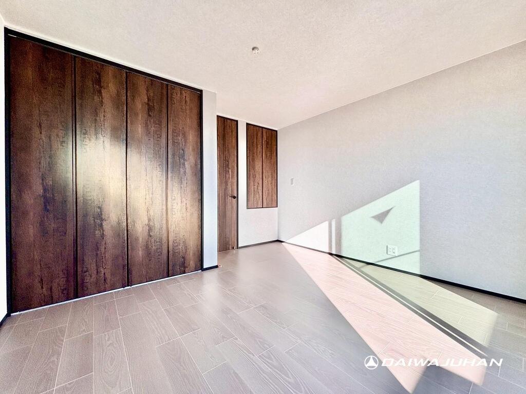 壁一面の収納を備えた洋室は、衣類や荷物もすっきり収まり、空間を有効活用できます。日当たりも良く、寝室や書斎など幅広く活用できます。