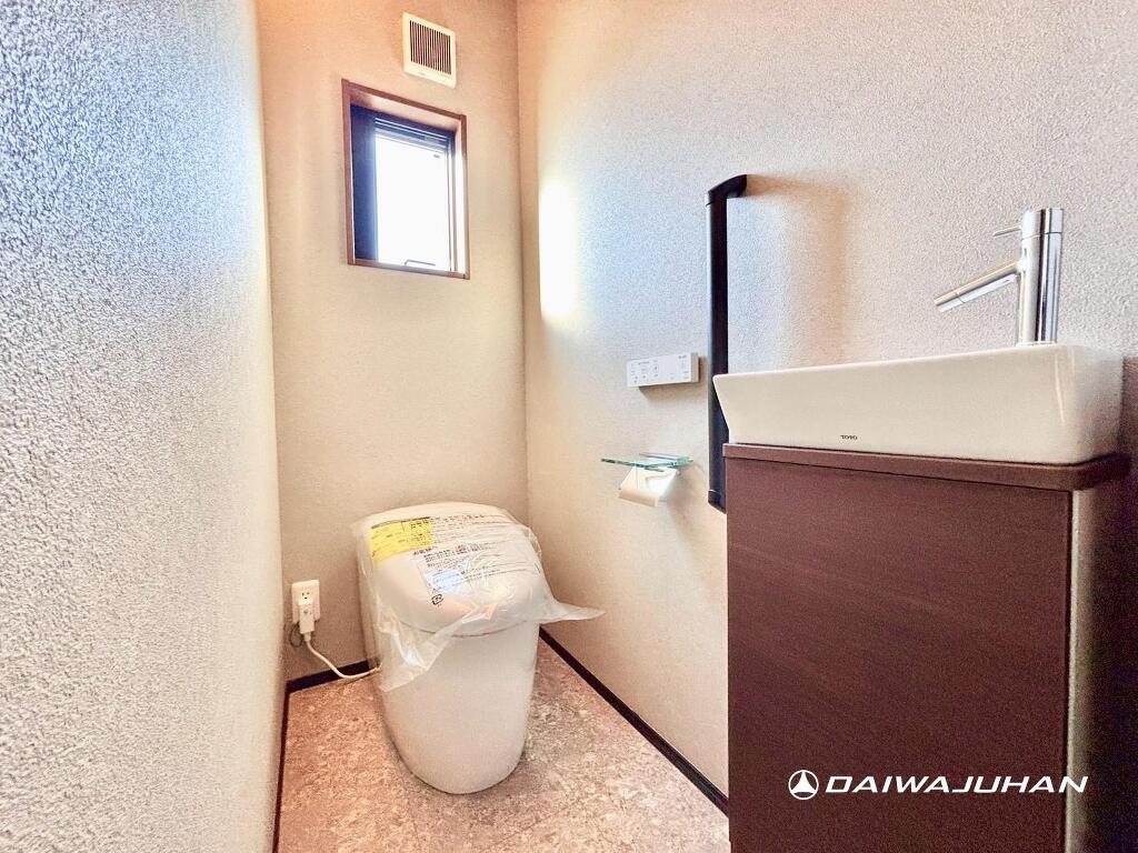 手洗いカウンター付きのトイレは、使い勝手と清潔感を兼ね備えた空間。小窓から自然光が差し込み、明るく快適に過ごせます。落ち着いた内装も魅力です。