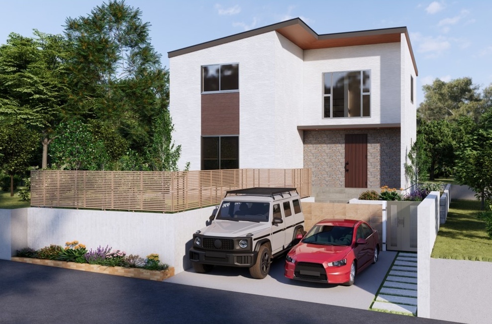 木と白壁が映える美邸。個性ある外観と2台分の駐車場付きで、暮らしに彩りとゆとりを。