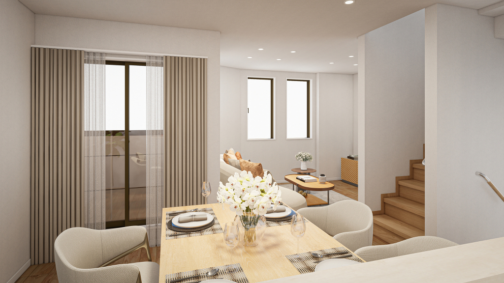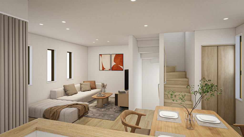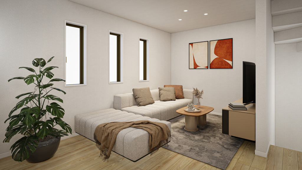 2号棟/大きなL字ソファをゆったり置けるリビングスペース。家族みんなで映画を観たり、友人を招いてくつろいだり。贅沢な団らんの時間が生まれます。