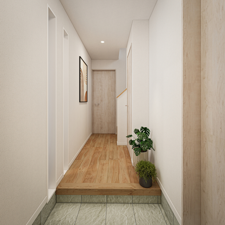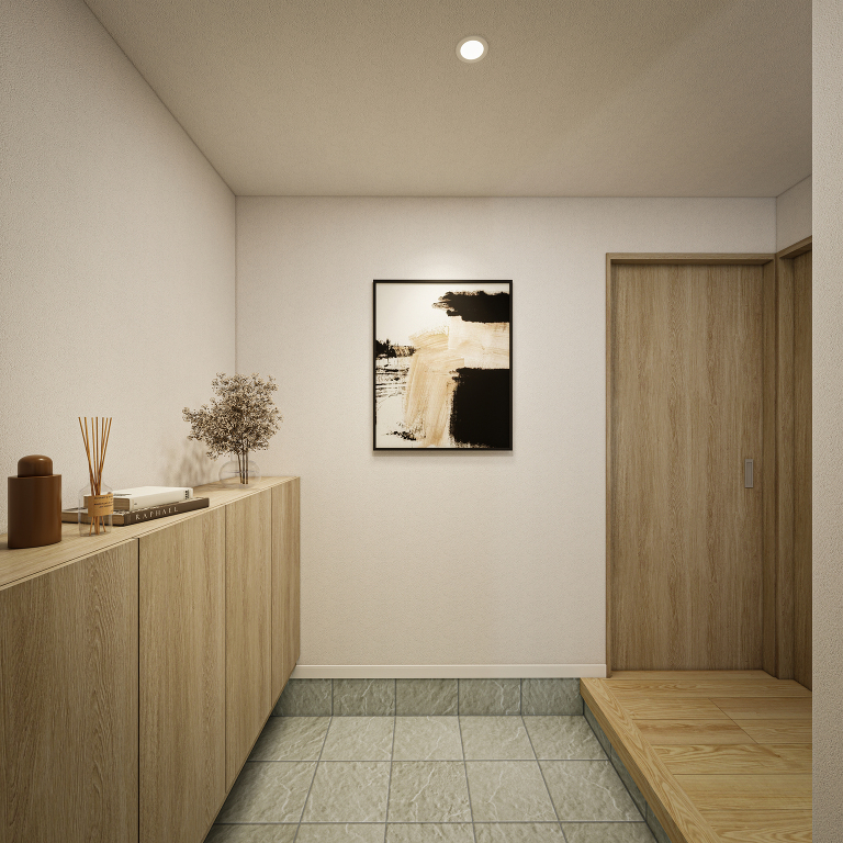 2号棟/3階建てとは思えないゆとりある玄関ホール。ベビーカーや荷物を持っての出入りもスムーズで、来客時も好印象です。
