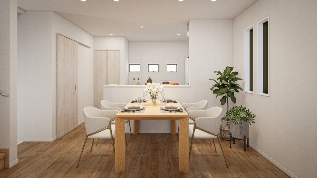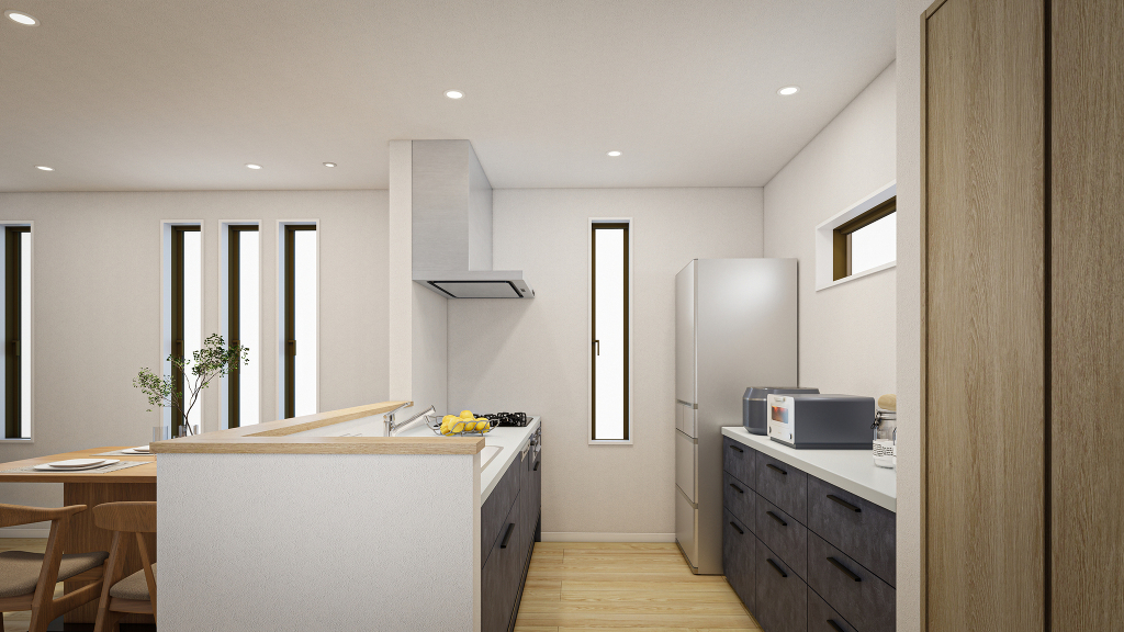 2号棟/会話を楽しみながら料理ができるオープンキッチン。食器や食材をたっぷりしまえるカップボードと収納付きで、常に美しいキッチンを保てます。
