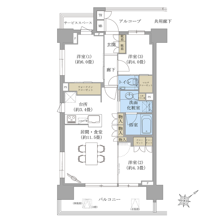 | 専有面積 | 65.96m²(19.95坪) | バルコニー面積 | 11.96m²(3.62坪)(南東向き) |