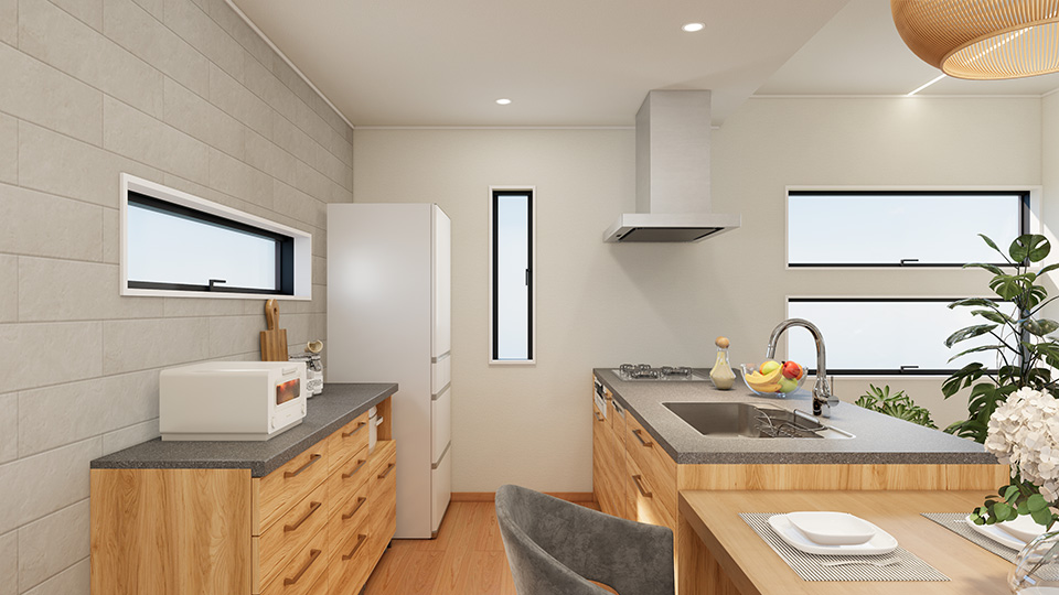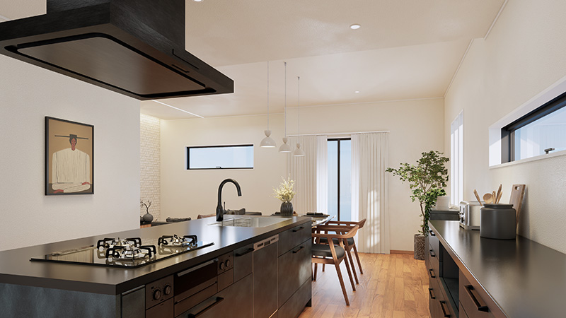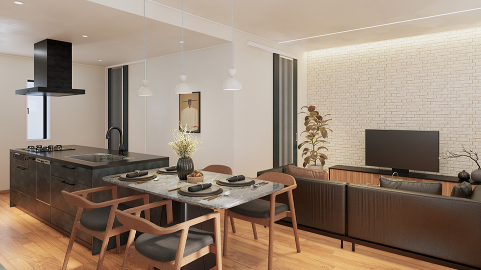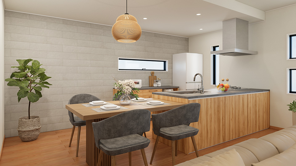 高級感漂う石目調のアイランドキッチンは、 デザイン性 と機能性を兼ね備えた贅沢仕様。 家族との会話が弾む オープンなレイアウトで、 料理の時間がもっと楽しくな る空間です。収納力も抜群で、整理整頓もスマートに。