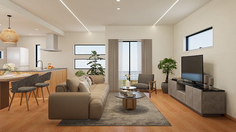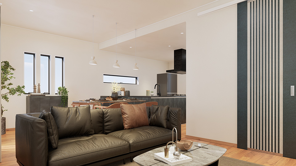 開放感あふれる吹き抜けリビングは、自然光がたっぷり差し込む贅沢な空間。ブラックアイアンの階段が空間のアクセントとなり、洗練されたモダンデザインを演出。家族の時間が心地よく流れる、優雅なひとときを叶えます。