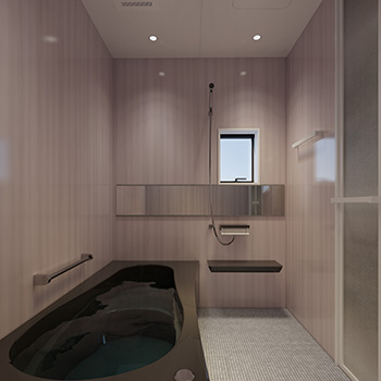 ホテルライクな上質空間が魅力の高級邸 宅。 スタイリッシュなブラックの浴槽と石 目調タイルが織りなすバスルームは、日々 の疲れを癒す極上のリラクゼーション。