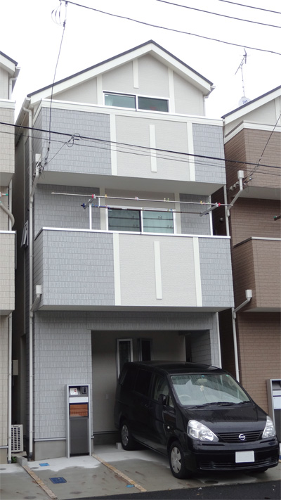 こうして井上さんご一家のマイホームとなったのが、横浜市港北区の便利な市営地下鉄沿線、最寄り駅から歩いてわずか3分ほどという好立地に建つ3階建ての新築住宅です。車一台のほか自転車なども置けるゆとりの駐車スペースを備えた建物の間取りは3LDK。1階には洋室一部屋とお風呂、日当たりの良い2階にはご一家のメインの生活スペースとなる広々としたLDK、3階には約6畳と8畳の洋室2部屋が配されています。