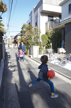 家の前でドッジボール。休日は家族みんなで楽しむ時間。