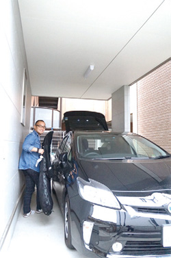 玄関横の駐車場。サーフィンに行く時は、海から上がった時に体を洗うお湯を持参で出かける。マンションの時は何往復もして準備が大変だったが、それが今はさっとできるようになった。