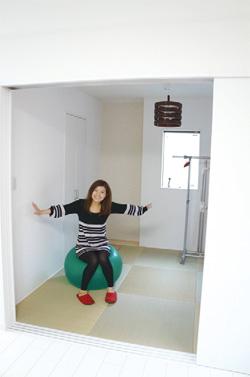 2階のリビングと続いている和室。ここでよくバランスボールに乗っているという奥さま。