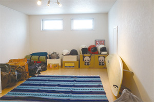 リビングの階段を上がったところにあるロフト。ご主人の趣味のものが主に納められている。