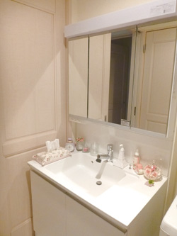 洗面台は広々として使い勝手もよいそう。石けんなどのアイテムにも奥さまのセンスが光る