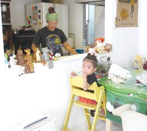 キッチンでご家族と会話をしながら料理を作る奥さま。黄色い椅子はお子さんのお気に入り -