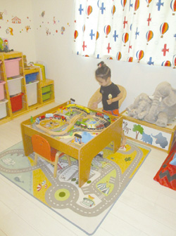 楽しい雰囲気の子供部屋。大好きな鉄道模型をじっと見つめるお子さんの姿が印象的 -