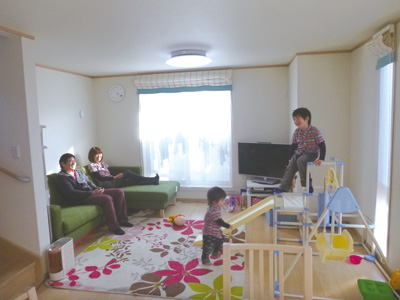ご夫婦にお気に入りのポイントをおうかがいしました。「キッチンが広くて使いやすいです。対面式なので子どもたちの様子を見守りながら支度できるところも気に入っています」と奥さま。「リビングのソファでゆっくりくつろげます。それから子どもたちのお気に入りはテレビの付いた浴室です」とご主人。また今井さんは『大和住販不動産フェア・ご成約プレゼント』の抽選で液晶テレビが当選!「家族でテレビを見たり、ゲームで遊んだりと活躍しています」と、喜びを話してくださいました。