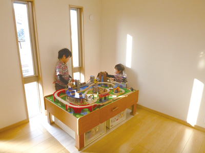 3階の子ども部屋にはお子さんたちお気に入りの電車のおもちゃを。兄弟のお気に入りの空間