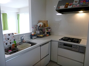 L字型のキッチンは作業スペースが広くて使いやすい。 食器洗浄乾燥機も付いている |