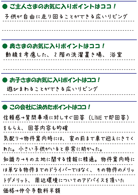 過去に、“仲介手数料無料”と表示しているサイトに会員登録をしたことがあるO様、しかし全く連絡が来ないという経験があったので、大和住販に対しても、「仲介手数料無料と言っているので営業さんにも期待していなかった」のだそうです。けれども、「問い合わせをするとすぐに連絡がきて、「ご覧になりませんか?」と案内してくれた」 と、そのレスポンスの速さもさることながら、「それまでの(不動産屋さんの)営業さんは現場まで連れて行って、中を見せて終わりだったけど、大和住販の担当営業さんは業界経験が長いのか、知識がとても豊富で、良いことだけでなく、家の欠点も伝えてくれたので信用できた」と振り返ります。