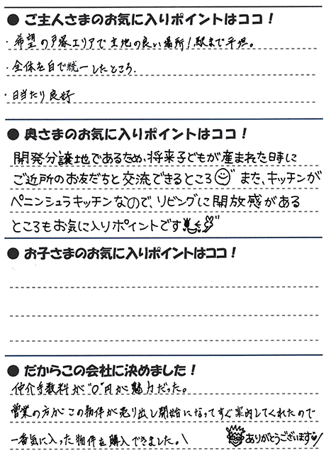 「営業さんが一生懸命やってくださって、助かったし嬉しかったですね!おかげで思い通りの場所に家を買うことができました。」
