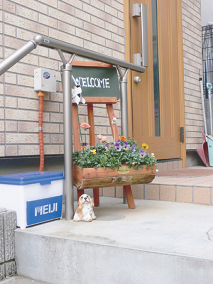 階段の上にある玄関脇には、かわいらしいwelcomeのボードが