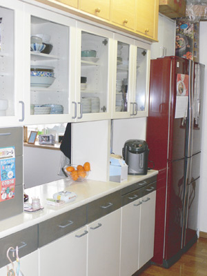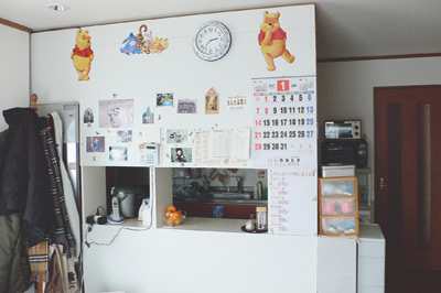 「前から使っていたキッチンの棚をキッチンカウンター風にしているんですよ」と話してくださったのは奥さま。確かに、リビングとの間に棚が置かれ、目隠し兼カウンターとして上手く利用されています。棚の裏面にあたるリビング側には、白いボードがきれいに貼られています。「これは自分で貼ったんですよ」と話してくださったのはご主人。「家族の写真やメモなどを貼るスペースとして利用しています」。