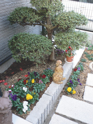奥さまが手入れをされているという玄関周りの前庭。きれいに手入れされ、花も植えられている