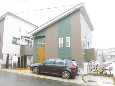 こうして松原さんが横浜市旭区の高台に、まだ土地の状態のマイホームを購入されたのが2010年の5月の終わりのこと。そこからお2人が建築会社との打ち合わせを重ね完成させたのが、緑と茶色の外壁が目を引く3LDKのマイホームです。土地の傾斜に合わせて中2階に造られた玄関から数段の階段を上がった2階には約21畳もの広さのある開放的なLDK、1階には洋室3部屋とバスルームが配された個性的な造りの建物には、お2人のこだわりが詰まっています。