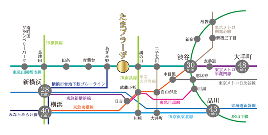 急行に乗れば、渋谷駅まで約21分。二子玉川駅へは約10分。東京メトロ半蔵門線に乗り入れているため、表参道駅や永田町駅、大手町駅へも直通で行くことができます。